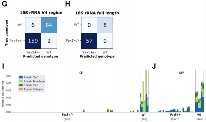 我們通過獨(dú)立地將機(jī)器學(xué)習(xí)方法應(yīng)用于3983個(gè)ASV,進(jìn)一步將基因型分離ASV的集合細(xì)化到只有40個(gè)。ASV根據(jù)特征重要性進(jìn)行排序,由“隨機(jī)森林”算法確定,41個(gè)ASV用50%的樣本進(jìn)行訓(xùn)練,并在剩余50%的樣本上進(jìn)行測(cè)試。這40個(gè)ASV足以準(zhǔn)確(96.8%)預(yù)測(cè)小鼠基因型(圖1G)。事實(shí)上,這種機(jī)器學(xué)習(xí)工具能夠預(yù)測(cè)小鼠的基因型,這證實(shí)了Pax5雜合性形成了特定的腸道微生物群落。值得注意的是,16S rRNA全長測(cè)序使我們僅使用5212個(gè)全長ASV中的4個(gè),就進(jìn)一步提高了Pax5+/-和WT動(dòng)物之間的基因型預(yù)測(cè)的準(zhǔn)確性,準(zhǔn)確率達(dá)到100%(圖1H)。WT和Pax5+/-小鼠微生物群的主要區(qū)別在于Pax5+/-小鼠缺乏完整的共生菌。具體地說,在WT小鼠中可以檢測(cè)到的Rikenellaceae、S24-7和Oscillospira屬的成員在CF的Pax5+/-小鼠的微生物群落中缺失(圖1I)。在SPF中,在Pax5+/-小鼠的微生物群落中沒有檢測(cè)到Rikenellaceae和Oscillospira屬的成員(圖1J)。