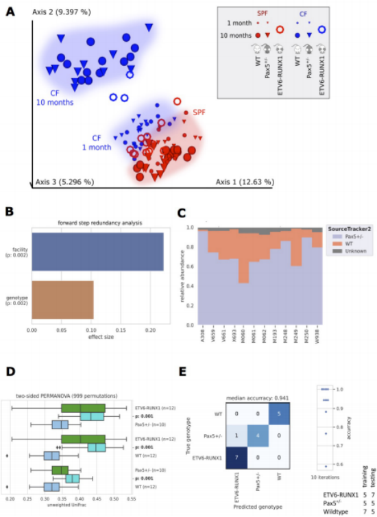 Sca1-ETV6-RUNX1小鼠在SPF組10個(gè)月時(shí)和CF組3~4個(gè)月時(shí)進(jìn)行微生物群分析。將這些數(shù)據(jù)與我們之前的分析相結(jié)合,證實(shí)了環(huán)境(設(shè)備)和基因型是形成腸道微生物群的關(guān)鍵因素(圖2A,B)。SourceTracker2分析表明,Pax5+/-微生物來源在Sca1-ETV6-RUNX1微生物群的組成中也很突出(圖2C),PERMANOVA分析結(jié)果證實(shí),所分析的基因型形成的微生物群有統(tǒng)計(jì)學(xué)上的顯著差異(圖2D)。使用10個(gè)最重要的ASV(有1000棵樹的隨機(jī)森林),可以通過機(jī)器學(xué)習(xí)準(zhǔn)確地預(yù)測(cè)易感基因型(圖2E)。這些分析證實(shí),在遺傳上易患PB-ALL的基因型都有不同的微生物群,獨(dú)立于外圍的B細(xì)胞有缺陷。