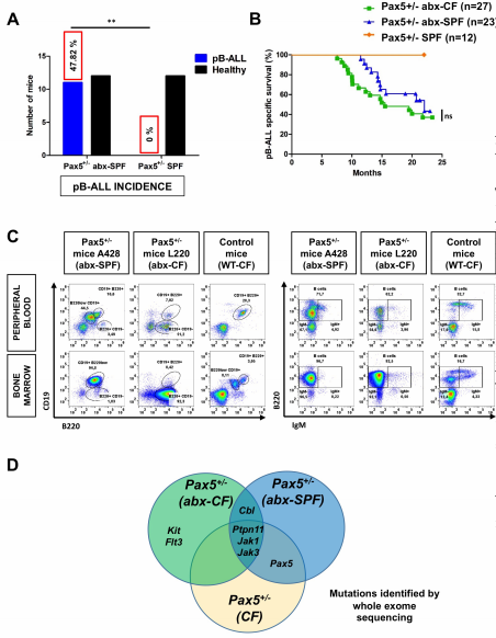 我們考慮了在SPF條件下腸道生理性微生物群的作用,以及在沒有自然感染誘因的情況下,通過細(xì)菌枯竭來改變它是否會(huì)導(dǎo)致白血病的發(fā)生。為了測(cè)試這一點(diǎn),另外一組出生在SPF的23只Pax5+/-小鼠沒有被轉(zhuǎn)移到CF,而是在整個(gè)實(shí)驗(yàn)過程中一直保持在SPF中。這些小鼠接受抗生素治療。