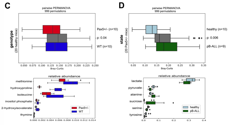 接下來,我們調(diào)查了小鼠血清中的代謝體成分是否能幫助我們識(shí)別遺傳性PB-ALL的易感性。為了驗(yàn)證這一點(diǎn),我們用GC-MS分析了SPF飼養(yǎng)的WT(n=10)和Pax5+/-(n=10白血病前期,n=10白血病)小鼠的代謝組(圖6A)。PCoA表示按基因型和健康狀況進(jìn)行聚類(圖6B)。我們發(fā)現(xiàn)52種化合物中有6種在WT和白血病前期Pax5+/-小鼠之間差異顯著(圖6C)。與白血病Pax5+/-小鼠血清樣本相比,健康的白血病前期Pax5+/-小鼠血清樣本中有16種化合物含量顯著不同(圖6D顯示了前6種化合物)。