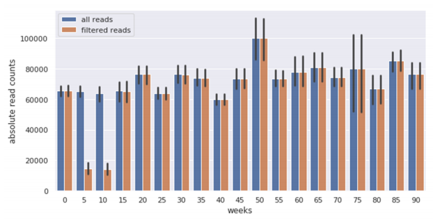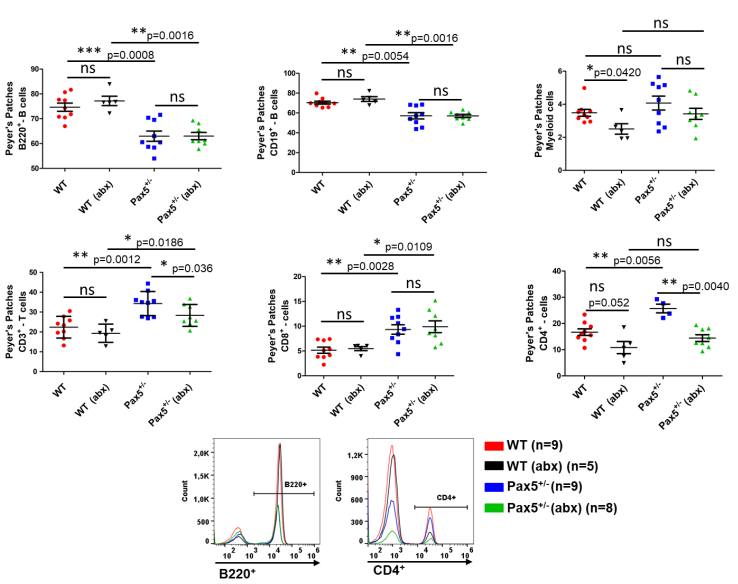 我們?cè)O(shè)立了第二個(gè)小鼠隊(duì)列,命名為“ABX”,并用抗生素治療這些小鼠以清除細(xì)菌。這個(gè)隊(duì)列由27只Pax5+/-和18只WT小鼠組成,我們?cè)谵D(zhuǎn)移時(shí)(在服用抗生素之前)、抗生素治療后4周和8周收集糞便顆粒,然后每?jī)芍苁占淮危钡揭恢恍∈蟪霈F(xiàn)明顯的PB-ALL癥狀或達(dá)到其自然壽命的終點(diǎn)。通過微生物分析、糞便DNA濃度分析和16S rRNA擴(kuò)增序列測(cè)定(圖S7),證實(shí)了抗生素雞尾酒的殺菌效果。在抗生素治療期間從小鼠身上收集的糞便樣本主要包含來自它們植物性飲食的Read(平均82%的Read可以歸類為葉綠體或線粒體來源)。當(dāng)我們分析抗生素治療對(duì)不同器官造血室的影響時(shí),我們觀察到抗生素治療并不改變WT或Pax5+/-小鼠的B細(xì)胞發(fā)育。然而,在抗生素治療后,我們觀察到Pax5+/-小鼠外周血中成熟B細(xì)胞的減少,但未觀察到WT小鼠中成熟B細(xì)胞的減少。