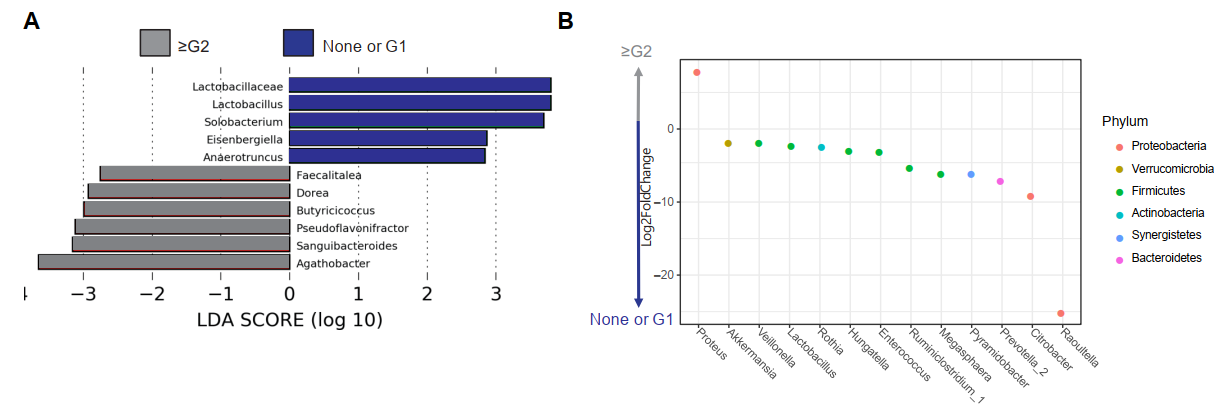 考慮到GM與irAE之間的可能存在聯(lián)系,作者分析了經(jīng)歷臨床相關(guān)irAE的患者(>2級)和不嚴重的irAE患者(1級或無)之間的GM組成間的差異。在未接受ATB治療的患者和所有患者中,組間的細菌多樣性沒有差異。LEfSe分析中Lactobacillaceae和DESeq2分析中Raoultella?在未經(jīng)歷嚴重irAE患者糞便中富集(圖4A和4B)。盡管Akkermensia與改善的臨床結(jié)果無關(guān),但是其與較輕的irAE相關(guān)(圖4B)。
