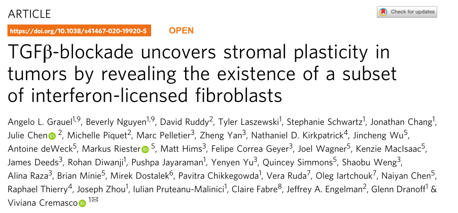 總之,這些數(shù)據(jù)表明,TGFβ-阻斷可導(dǎo)致小鼠和人類(lèi)腫瘤成纖維細(xì)胞的重塑,暴露了一種獨(dú)特的CAF群體的誘導(dǎo),其特征是對(duì)IFN的明顯反應(yīng)和相當(dāng)大的免疫調(diào)節(jié)潛能。
