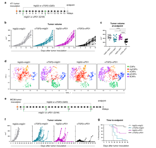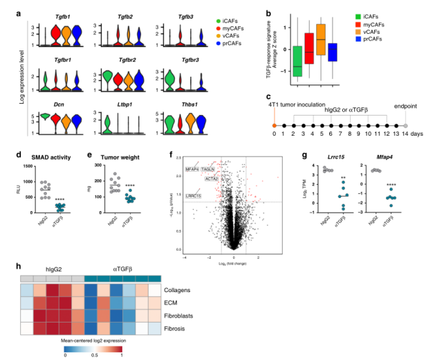 綜上所述,這些數(shù)據(jù)促使我們研究TGFβ-阻斷劑在體內(nèi)對(duì)CAF表型和功能的相對(duì)影響。為此,6周齡雌性小鼠接種4T1腫瘤細(xì)胞,隨后用TGFβ阻斷抗體或同型對(duì)照處理,研究設(shè)計(jì)如圖2c所示。結(jié)果表明這種腫瘤進(jìn)展的延遲似乎不是由抗TGFβ對(duì)腫瘤細(xì)胞的直接作用引起的,更可能是TGFβ阻斷后微環(huán)境變化的結(jié)果。事實(shí)上,使用TGFβ中和抗體可導(dǎo)致整體基因表達(dá)的顯著差異,這在對(duì)大量冷凍腫瘤RNAseq分析中得到證實(shí)(圖2f)。與這些發(fā)現(xiàn)一致的是,我們通過(guò)分析與膠原沉積和纖維化相關(guān)的基因特征,描述了抗tgfβ治療小鼠腫瘤中整體促纖維化程序的顯著減少(圖2h)。綜上所述,這些數(shù)據(jù)表明靶向TGFβ影響了腫瘤微環(huán)境中的成纖維細(xì)胞動(dòng)力學(xué)。