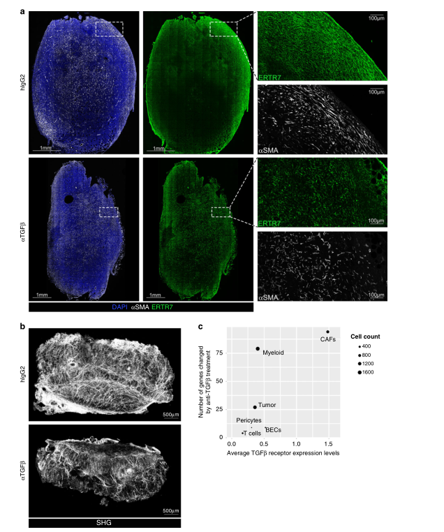 根據(jù)觀(guān)察到的基因表達(dá)變化,作者利用冷凍保存的腫瘤從同型或抗tgfβ處理小鼠切片,染色和共聚焦顯微鏡成像等方法確定了TGFβ-阻斷是否對(duì)構(gòu)成腫瘤建筑框架結(jié)構(gòu)產(chǎn)生損傷。Acta2表達(dá)的鏡像變化,肌成纖維細(xì)胞網(wǎng)絡(luò)的顯著改變,細(xì)長(zhǎng)的紡錘形細(xì)胞稀少等揭示了瘤內(nèi)結(jié)構(gòu)組織的顯著變化,表明TGFβ阻斷抗體處理小鼠的高網(wǎng)狀纖維網(wǎng)絡(luò)丟失(圖3a)。通過(guò)對(duì)全器官的斷層掃描,進(jìn)一步證實(shí)了膠原骨架形成的整體損傷,如圖3b所示。單細(xì)胞RNAseq分析結(jié)果表明基因的數(shù)量受anti-TGFβ治療明顯更大 (圖3 c),也與先前的結(jié)果一致。