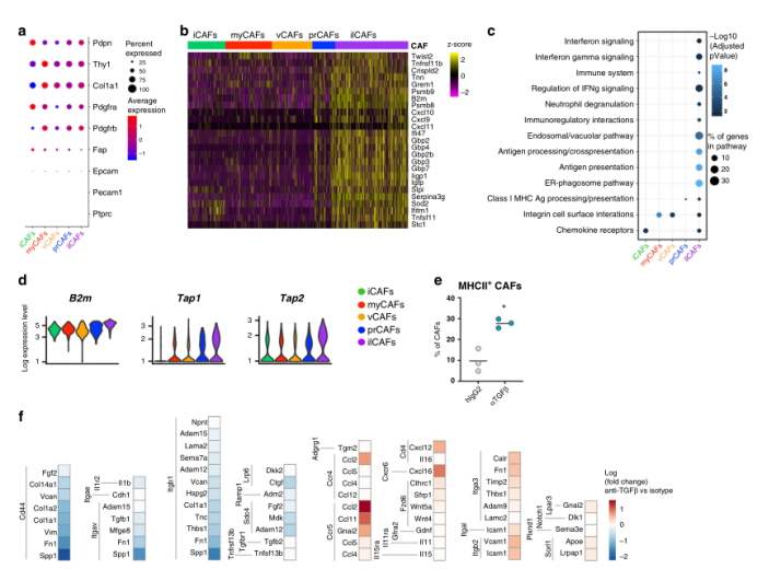 為了獲得關(guān)于新鑒定的CAF亞群功能特性的更多信息,作者研究了這類(lèi)亞群的轉(zhuǎn)錄特征。然而,對(duì)ilCAFs中差異表達(dá)基因分析發(fā)現(xiàn),在干擾素(IFN)信號(hào)控制下許多鳥(niǎo)苷晚結(jié)合蛋白(Gbp)家族成員發(fā)生富集(圖5b)。與這些發(fā)現(xiàn)一致的是,在區(qū)分ilCAFs與其他CAF亞群的基因中, ilCAFs中IFN信號(hào)反應(yīng)上調(diào),IFN水平調(diào)控的通路增強(qiáng),包括抗原加工和展示(圖5c)。編碼MHC蛋白和MHC相關(guān)分子的基因在ilCAFs中高表達(dá)(圖5b-d)。體內(nèi)TGFβ-阻斷后,在CAFs中檢測(cè)到MHCII蛋白上調(diào)(圖5e),也發(fā)現(xiàn)ilCAFs在腫瘤內(nèi)對(duì)指導(dǎo)T細(xì)胞的轉(zhuǎn)運(yùn)發(fā)揮重要作用(圖5b)。