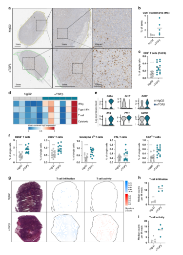 TGFβ-中和后CAF重塑,特別是具有潛在T細(xì)胞調(diào)節(jié)活性的CAF亞群的出現(xiàn),促使我們確定TGFβ-阻斷對(duì)建立抗腫瘤免疫反應(yīng)的影響。由于ilCAFs中T細(xì)胞趨化分子基因表達(dá)升高,CD8免疫組化染色顯示細(xì)胞毒性T細(xì)胞浸潤(rùn)在治療組之間存在較大差異(圖6a)。流式細(xì)胞分析證實(shí)了TGFβ-阻斷作用下細(xì)胞毒性T細(xì)胞數(shù)量的增加(圖6c),支持TGFβ-阻礙可能導(dǎo)致免疫細(xì)胞反應(yīng)的全面覺(jué)醒。在單細(xì)胞水平上也證實(shí)了這些發(fā)現(xiàn)。為了評(píng)估這種與浸潤(rùn)T細(xì)胞組織分布相關(guān)的激活程度,我們隨后通過(guò)空間轉(zhuǎn)錄組分析生成了與T淋巴細(xì)胞存在及其活性相關(guān)基因的腫瘤路圖。