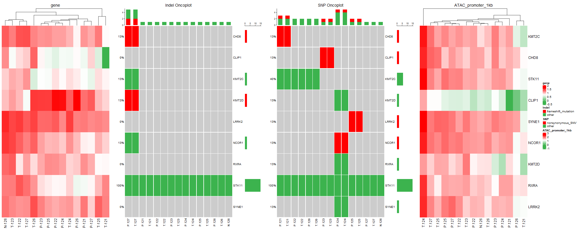 其中需要注意的是當(dāng)有多個(gè)基因瀑布圖時(shí),alter_fun和col需在同一條命令中設(shè)置。通過(guò)以上一頓操作,快速將基因瀑布圖和熱圖組合在一起,既展示了基因的結(jié)構(gòu)變異、開(kāi)放狀態(tài)、基因表達(dá),呈現(xiàn)多組學(xué)的角度探討疾病發(fā)生發(fā)展。這不就完成了Fig1還升華了Fig1的深度。