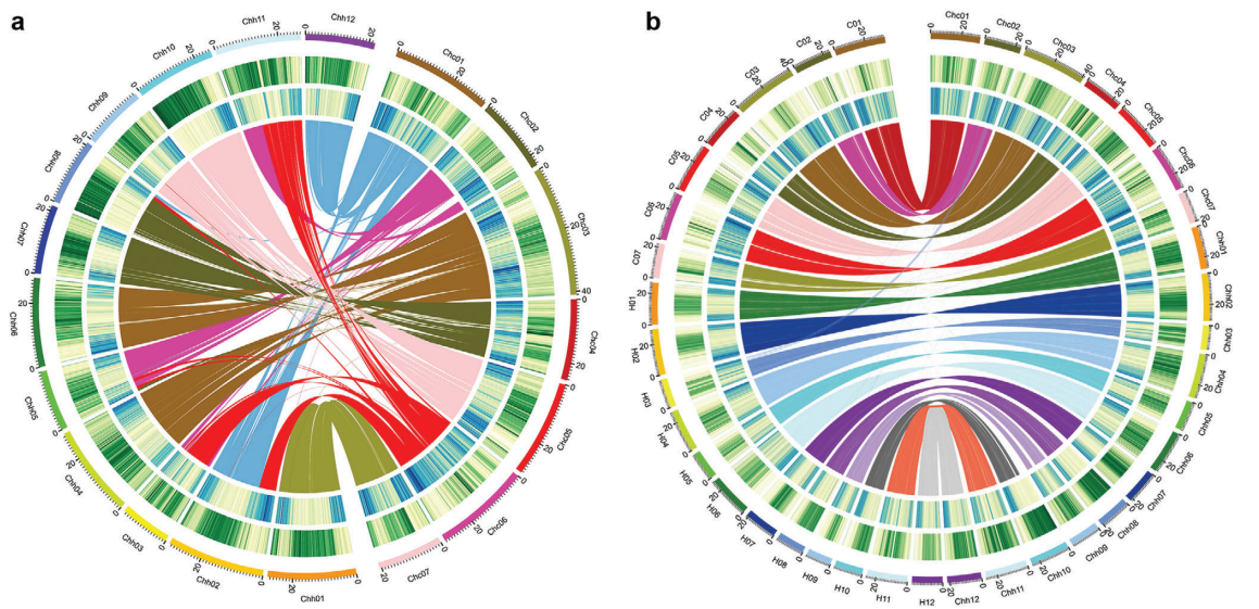 作者通過PacBio+BioNano+Hi-C+Illumina共組裝獲得530.8?Mb基因組(≈67%流式評估大??;≈77% survey評估大?。槐葘Πl(fā)現(xiàn)未裝出的為重復(fù)序列),contig N50=6.5?Mb,并將組裝的基因組序列掛載至19條假染色體上(掛載率97.23%;定序與定向率93.33%)(表1)。通過與二倍體C.sativus (CC)和C.hystrix(HH)染色體的C01–C07和H01–H12對應(yīng),將C.×hytivus染色體命名為Chc01–Chc07和Chh01–Chh12(圖1)。