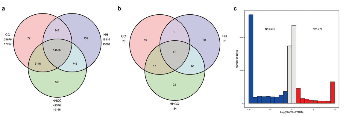 與已測序的栽培黃瓜基因組一樣,金瓜中大部分的TE為長末端重復(fù)序列。C.×hytivus(S14)的Chc亞基因組(SubC)含有的TEs少于二倍體C.sativus(CC)基因組,而Chh亞基因組(SubH)保持了幾乎相同的不同類型TEs的含量和比例。共預(yù)測了45687個基因,平均基因長3846bp,每個基因有5.26個外顯子。BUSCO評估結(jié)果為90.90%,CEGMA評估結(jié)果為97.82%。在CC和HH二倍體基因組中鑒定的18882個同源基因家族中,在C.×hytivus(S14)異源四倍體中也鑒定了18428個(97.60%)(圖2)。