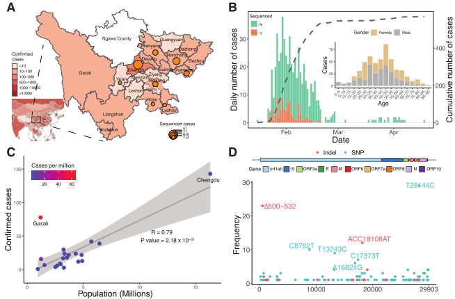 與20家醫(yī)院和研究機(jī)構(gòu)合作,分析了在2020年1月22日至2月20日期間在中國(guó)四川省收集的流行病學(xué)、遺傳和臨床數(shù)據(jù)。2020年1-2月底,四川省經(jīng)qPCR檢測(cè)確診病例538例,其中成都病例占28.8%(圖1A)。四川確診病例呈指數(shù)增長(zhǎng),2020年1月30日達(dá)到高峰,每天新增確診病例38例(圖1B)。若人員更密集,發(fā)生病例的頻率更高(圖1C),表明社交距離可能是防止病毒傳播的一個(gè)關(guān)鍵因素。