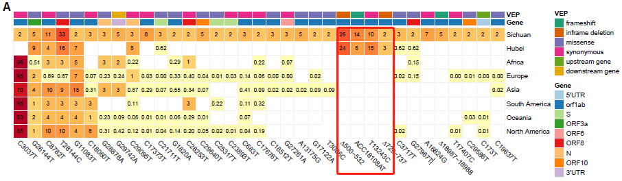 對(duì)截至2020年11月9日存放在GISAID上的81391個(gè)高質(zhì)量公共基因組序列進(jìn)行分析,其中35個(gè)snp中有29個(gè)(82.8%)來(lái)自其他大洲;一些變異(C3037T、G26144T、C8782T、T28144C、G11083T和C18060T)在歐洲、非洲、大洋洲和美國(guó)流行,表明大多數(shù)snp已經(jīng)在世界范圍內(nèi)流行。與武漢人群的比較顯示,四川和武漢都存在另外四種變體,這些復(fù)發(fā)型包括三個(gè)Indels:Δ500-532, ACC18108AT和Δ729-737;一個(gè)SNP:T13243C(圖2A),表明這些變異可能是從武漢輸入的,與四川患者的旅行記錄一致。