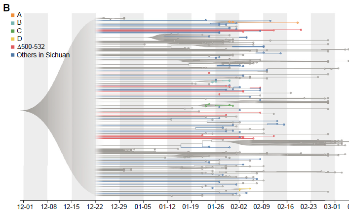 值得注意的是,在Nsp1編碼區(qū)有兩個(gè)缺失,Δ500-532和Δ729-737,在四川觀察到23例(26%)和2例(2.2%);在武漢觀察到39例(24%)和4例(3%)。對(duì)Δ500-532的基因組進(jìn)行了研究,發(fā)現(xiàn)它在系統(tǒng)發(fā)育樹(shù)的不同簇中分布稀疏(圖2B)。結(jié)果表明Δ500-532發(fā)生在多個(gè)城市,并可能從武漢多次輸入,這與缺失Δ500-532的四川患者中有83.3%的人有去過(guò)武漢的旅行史相一致。