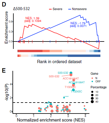 采用類(lèi)似GSEA的分析方法,來(lái)鑒定一個(gè)突變體是否富集嚴(yán)重/非嚴(yán)重的臨床表型。發(fā)現(xiàn)Δ500-532與ESR等嚴(yán)重相關(guān)表型呈負(fù)相關(guān)?;谟?沒(méi)有某種變異類(lèi)型,將病例分為兩組,發(fā)現(xiàn)感染Δ500 -532病毒的患者在所有檢測(cè)的35種變異中Ct值最高(圖3E)。