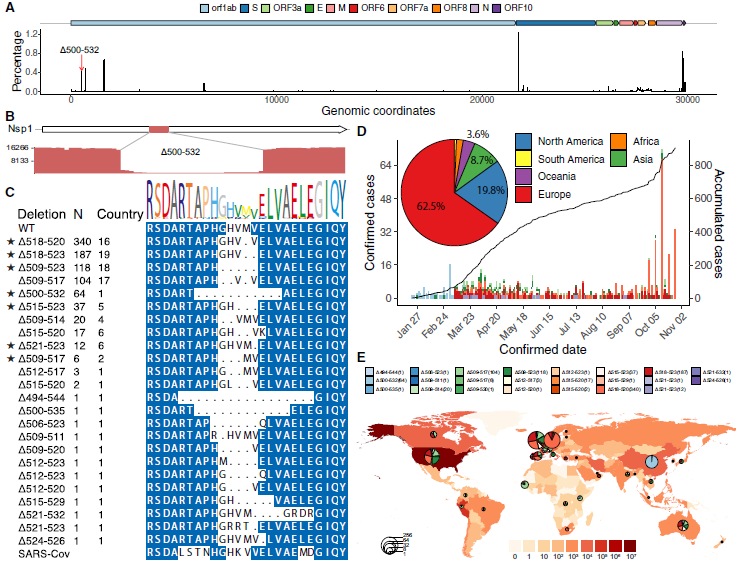 計(jì)算了SARS-CoV-2基因組中每個(gè)堿基對(duì)的缺失頻率,Δ500-532位點(diǎn)是第五大最常見(jiàn)的缺失區(qū)域(圖4A)。測(cè)序結(jié)果支持高序列深度的缺失,并通過(guò)Sanger測(cè)序驗(yàn)證了缺失(圖4B)。從GISAID的37個(gè)國(guó)家的922例病例中,在Δ500-532位點(diǎn)找到了24種缺失變異(圖4C)。其中62.5%和19.8%分別來(lái)自歐洲和北美(圖4D),主要變種為Δ518-520 (Δ1aa), Δ518-523 (Δ2aa)和Δ509-523(Δ5aa)(圖4E)。因此,研究結(jié)果顯示SARS-CoV-2基因組中存在一個(gè)缺失熱點(diǎn),相關(guān)病例數(shù)量在全球范圍內(nèi)穩(wěn)步上升。