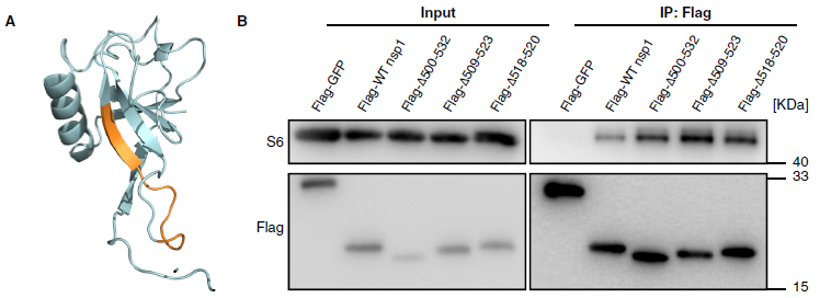 SARS-CoV-2 Nsp1的C端結(jié)構(gòu)域與40S核糖體亞基結(jié)合并干擾mRNA的進(jìn)入,但實(shí)驗(yàn)發(fā)現(xiàn)突變的SARS-CoV-2 Nsp1保留了與40S核糖體亞基的結(jié)合能力(圖5B)。