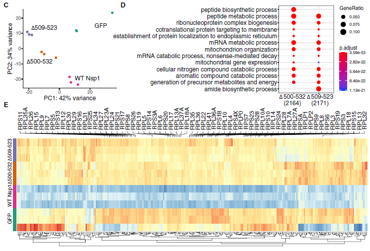 值得注意的是,與GFP對(duì)照相比,WT中編碼核糖體蛋白(RPs)的mRNA代謝過(guò)程通路中的許多基因下調(diào)。相比之下,有兩個(gè)缺失組表現(xiàn)出不同于WT更類(lèi)似于GFP對(duì)照的表達(dá)模式(圖5E)。這些結(jié)果表明,Nsp1中這些N端缺失可能影響其在mRNA和蛋白質(zhì)代謝過(guò)程中的功能