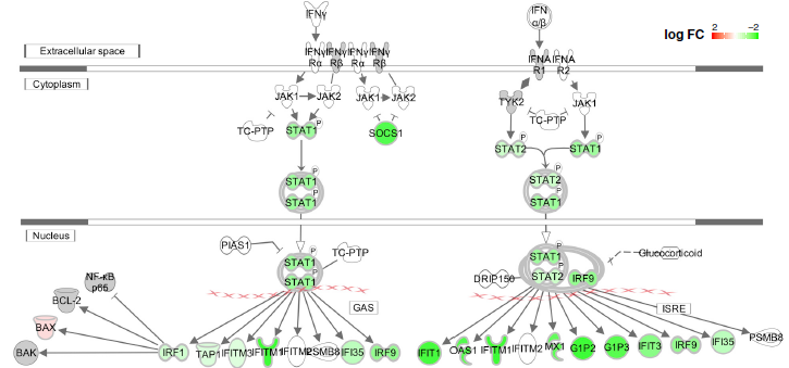 圖6G 與表達(dá)WT Nsp1的A549細(xì)胞相比,Δ500-532突變體中干擾素信號(hào)通路顯著下調(diào)(綠色表示下調(diào),紅色表示上調(diào))