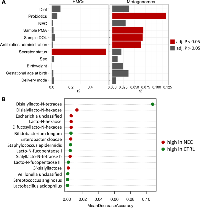 使用橫斷面HMO和橫斷面宏基因組數(shù)據(jù)集,作者試圖確定哪些臨床因素與HMO和細菌圖譜最相關(guān)(圖5A)。分泌狀態(tài)可以解釋HMO 56%的變異,其他協(xié)變量與HMO無顯著相關(guān)性。細菌圖譜與胎齡、DOL、抗生素使用和益生菌服用顯著相關(guān),而與母親的分泌狀態(tài)相關(guān)性不顯著??傊@些發(fā)現(xiàn)強調(diào)了HMO和細菌分布受多種非重疊因素影響。