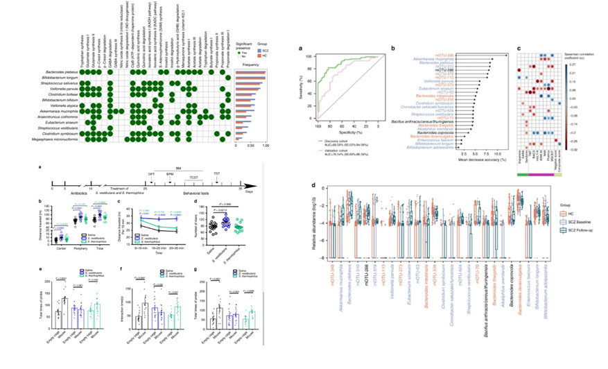 本文中研究者分析了90名無藥物治療精神分裂癥患者和81名健康對照者的糞便微生物組,確定了一種能夠區(qū)分患者和對照者的微生物物種分類器。研究者發(fā)現(xiàn)與精神分裂癥相關(guān)的功能性潛能包括短鏈脂肪酸合成、色氨酸代謝以及神經(jīng)遞質(zhì)的合成/降解等方面的差異。Streptococcus vestibularis(精神分裂癥中比較富集的細(xì)菌)的移植會引起小鼠的社交行為缺陷,并改變小鼠外周組織中神經(jīng)遞質(zhì)的水平。本文為隊(duì)列研究和動物模型的進(jìn)一步研究提供了新的線索。