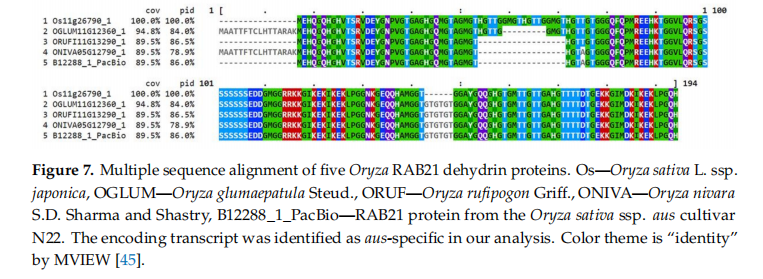 舉個例子,在高溫和干旱雙重脅迫下顯著上調(diào)的基因B12288。它在japonica和indica中均有同源基因RAB21,這個基因受干旱的誘導(dǎo),其編碼的蛋白屬于LEA脫氫蛋白家族。與水稻其它脫氫蛋白進(jìn)行多序列比對研究(圖7),N22實際上的基因與野生稻、O. sativa ssp. japonica中其它4種脫氫酶的親緣關(guān)系密切。序列覆蓋率為89.5%,序列同源性86.0%,其中包含脫氫酶高度保守的重復(fù)區(qū)。相比japonica蛋白,N22蛋白序列與野生稻更接近。