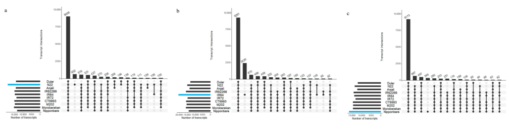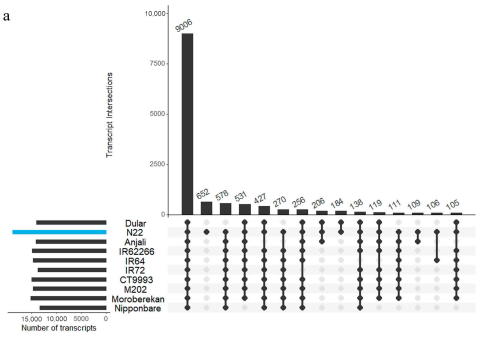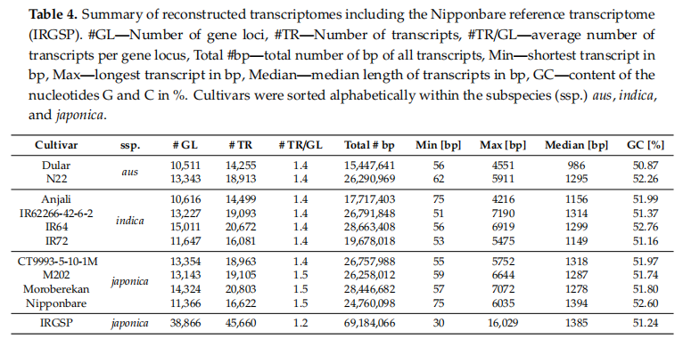 在過去的幾年里,RNA測序(特別是基于illumina的短序列RNA-seq)已經(jīng)成為分析轉(zhuǎn)錄組的有力工具,用來識別在非脅迫控制和各種環(huán)境脅迫條件下差異表達(dá)的基因。然而,需要基于參考基因組或轉(zhuǎn)錄組序列對RNA-seq數(shù)據(jù)進(jìn)行比對和注釋來確定轉(zhuǎn)錄水平。在水稻中,參考基因組決定了可以鑒別的差異表達(dá)基因和轉(zhuǎn)錄本亞型。顯然,參考基因組/轉(zhuǎn)錄組中沒有的基因的表達(dá)信息在分析過程中會丟失。這在研究耐脅迫的外來品種、陸地品種或野生稻種時尤其相關(guān),因為它們可能含有參考品種Nipponbare不存在的耐受基因。這將嚴(yán)重限制識別支持作物改良計劃的新候選基因的可能性。