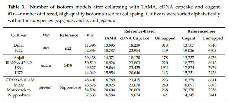 在文庫準(zhǔn)備過程中,會產(chǎn)生5 ‘ RNA降解產(chǎn)物,并進(jìn)行測序。這些降解產(chǎn)物具有相同的外顯子結(jié)構(gòu),但缺乏5 ‘序列信息,因此產(chǎn)生與技術(shù)偏差或生物學(xué)背景無關(guān)的冗余異構(gòu)體。我們測試了三種不同的去冗余方法,包括cogent、cDNA cupcake和TAMA,其中cDNA cupcake和TAMA需要基于參考基因組,而cogent不需要基于參考基因組。cogent基于pacbio全長轉(zhuǎn)錄本序列重構(gòu)一個參考基因組,然后將相同的序列比對到重建的基因組,基于比對結(jié)果利用cDNA cupcake算法對轉(zhuǎn)錄本去冗余。cDNA cupcake和TAMA直接用minimap2軟件和各自的亞種參考基因組進(jìn)行比對。基于這三種方法,只有很少的轉(zhuǎn)錄本不能回比到基因組上(表3)??偟膩碚f,這三種去冗余方法均能顯著減少異構(gòu)體的數(shù)量,分別為47.6% (cDNA cupcake,Nipponbare)和68.3%(cogent,Dular)。