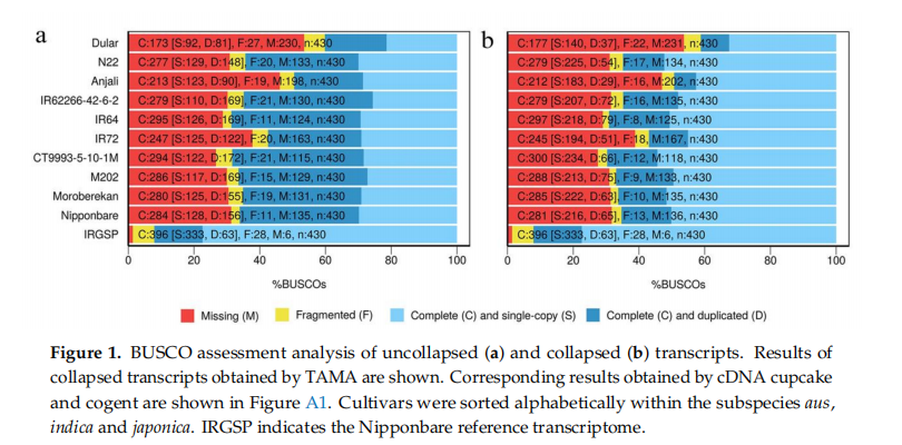 基于植物中430個高度保守的同源蛋白利用BUSCO軟件對TAMA算法去冗余前后的HQ進(jìn)行完整性評估(圖一),由于取樣不完全,缺失了54%~27%的重要蛋白,其中Nipponbare參考基因組(IRGSP)只缺失了6種。cDNA cupcake和TAMA的結(jié)果相似,而對于cogent,超過50%的蛋白缺失,最有可能的原因是轉(zhuǎn)錄本沒有回比到重建的基因組。