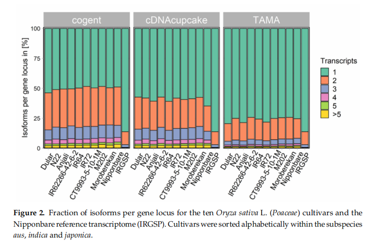 去冗余后轉(zhuǎn)錄本長度中值都有所增長,長度分布和轉(zhuǎn)錄本長度中值與Nipponbare參考基因組相似。統(tǒng)計了去冗余后10個品種每個基因相應(yīng)的轉(zhuǎn)錄本數(shù)量,其中基因只有一個轉(zhuǎn)錄本的比例,TAMA最高達(dá)到了75%,cDNA cupcake在60%左右,cogent只有50%。同時計算了Nipponbare參考基因組每個基因?qū)?yīng)的轉(zhuǎn)錄本數(shù)量進(jìn)行比較,該參考基因中基因只有一個轉(zhuǎn)錄本的比例達(dá)到了85%(圖2)。