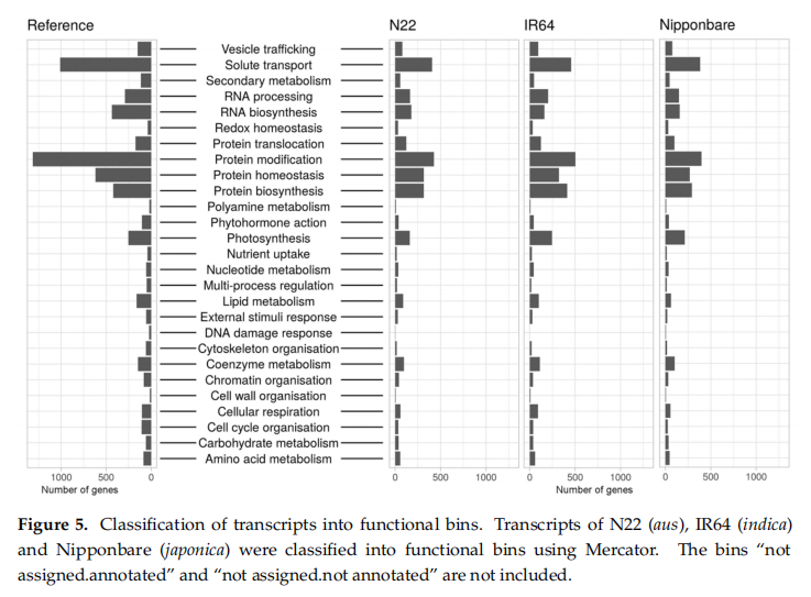 使用Trinotate和Mercator4進(jìn)行功能注釋。Mercator4是專門為植物開發(fā)的,它使用了一種簡單的層次樹結(jié)構(gòu),被稱為“容器”,用來描述生物學(xué)概念。主要的生物過程如光合作用,都是由頂層的容器來表示的,每個子容器描述的是一個更詳細(xì)的子過程。目前本體包括27個功能類別,代表了植物中不同的生物過程。N22、IR64和Nipponbare三個品種作為各自亞種的代表與植物中所有水稻基因的分類進(jìn)行比較分析,結(jié)果顯示三個品種的注釋結(jié)果分布相似(圖5)。超過28000個水稻已知基因在Mercator庫中沒有注釋分類信息,因此三個品種有8000~10000個轉(zhuǎn)錄本沒有分類注釋到Mercator庫。