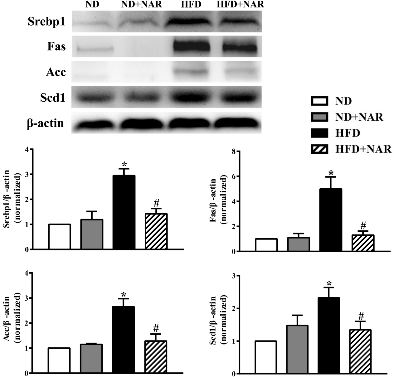 圖4 NAR對高脂小鼠肝臟脂肪生成相關蛋白表達的影響