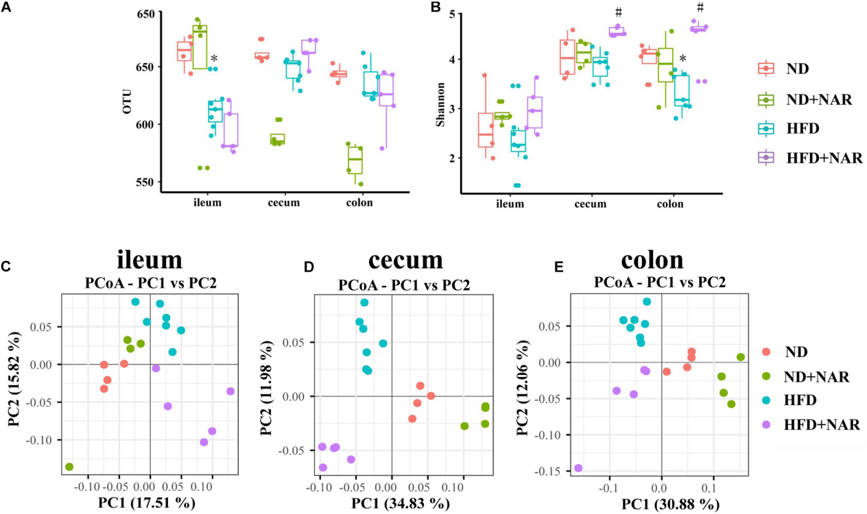 除HFD組回腸、盲腸和結腸的OTUs較ND組降低外,4組腸道不同部位的細菌OTUs無明顯差異(圖5A)。添加NAR降低了ND組小鼠盲腸和結腸OTUs。Shannon多樣性結果表明,高脂飼喂降低了結腸細菌多樣性,而NAR增加了盲腸和結腸細菌多樣性(圖5B)。高脂飼喂和NAR對回腸細菌多樣性沒有影響。