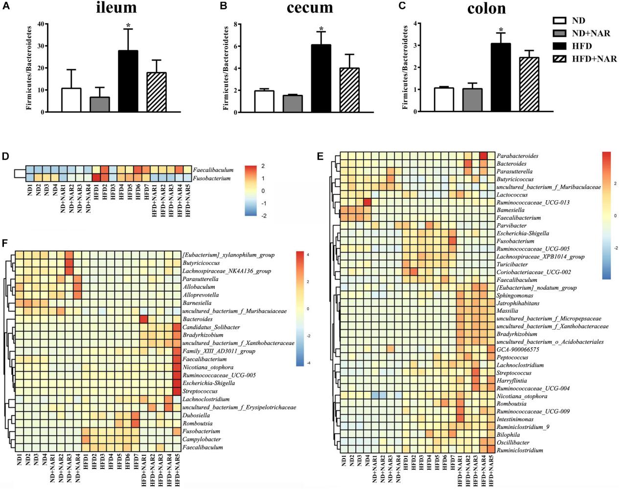 PCoA分析顯示,各處理組回腸、盲腸和結腸中細菌組成具有明顯差異(圖5C-E)。與ND組相比,HFD增加了厚壁菌門/擬桿菌門(Firmicutes/Bacteroidetes)比值,HFD+NAR組NAR增加了厚壁菌門/擬桿菌門比值(圖6A-C)。因此NAR影響了腸道菌群組成。