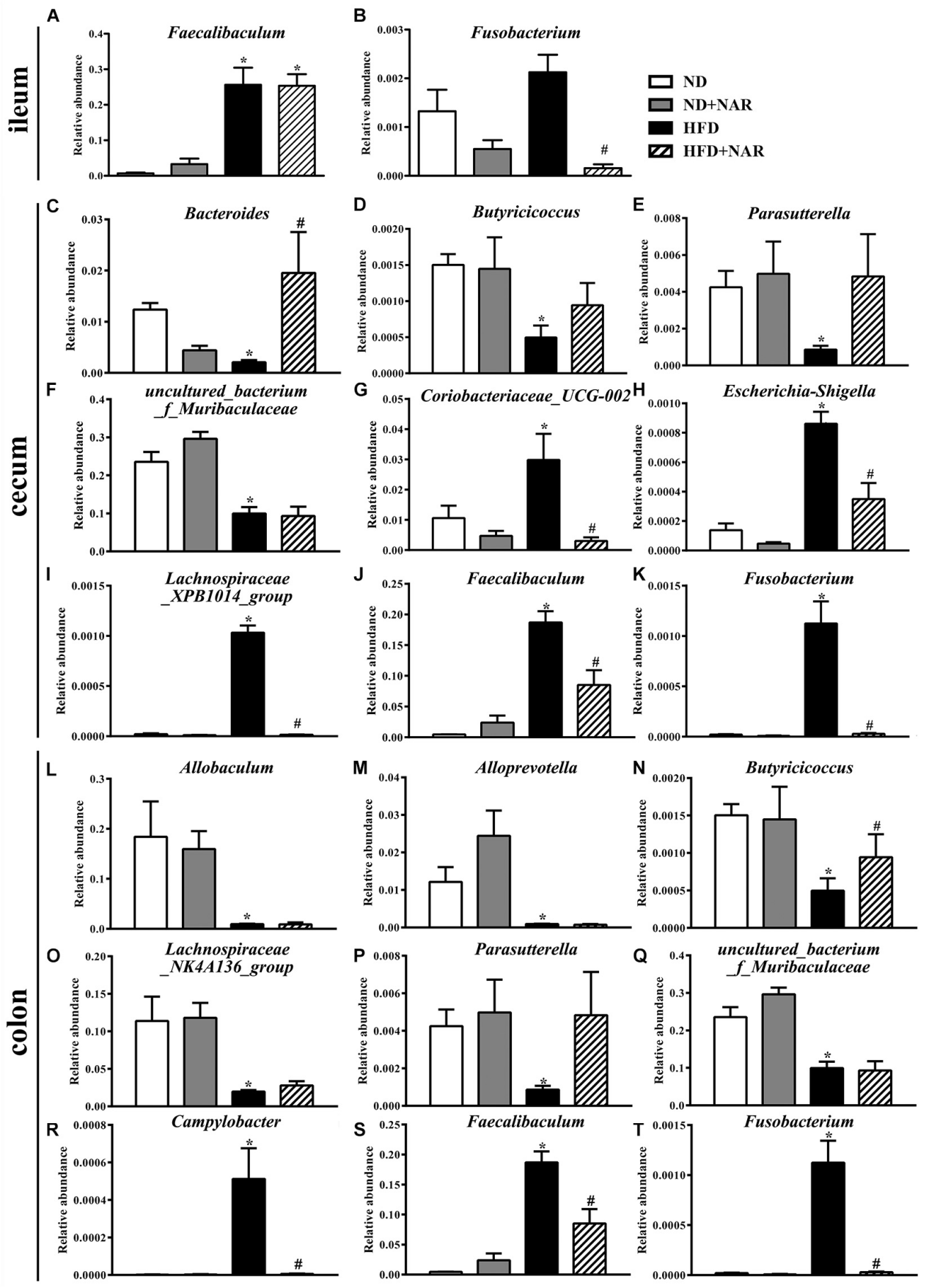 優(yōu)勢菌屬和差異菌屬熱圖顯示,補充NAR改變了HFD誘導的腸道細菌變化(圖6D-F)。與ND組相比,HFD組盲腸中Coriobacteriaceae_UCG-002、Escherichia-Shigella、Faecalibaculum、Fusobacterium、Lachnospiraceae_XPB1014_group、Parvibacter、Ruminococcaceae_UCG-005和Turicibacter相對豐度較高,Campylobacter、Dubosiella、Faecalibaculum和Fusobacterium在結腸中相對豐度較高,Bacteroides在盲腸中相對豐度較低,Butyricicoccus在結腸中相對豐度較低。NAR處理逆轉了這些效果。與ND組相比HFD飼喂小鼠腸道菌群顯示Butyricicoccus、Parasutterella和uncultured_bacterium_f_Muribaculaceae在盲腸中相對豐度較低,Allobaculum、Alloprevotella、Lachnospiraceae_NK4A136_group、Parasutterella和uncultured_bacterium_f_Muribaculaceae在結腸中相對豐度較低,Faecalibaculum在回腸中相對豐度較高。HFD+NAR組Bradyrhizobium、[Eubacterium]_nodatum_group、GCA-900066575、Jatrophihabitans、Massilia、Peptococcus、Sphingomonas、uncultured_bacterium_o_Acidobacteriales、uncultured_bacterium_f_Micropepsaceae和uncultured_bacterium_f_Xanthobacteraceae在盲腸中相對豐度較高,Bacteroides、Bradyrhizobium、Candidatus_Solibacter和 uncultured_bacterium_f_Xanthobacteraceae在結腸中相對豐度較高,Fusobacterium在回腸中相對豐度較低。圖7為相對豐度改變的細菌統計結果,這些結果表明NAR調節(jié)了HFD小鼠腸道細菌。