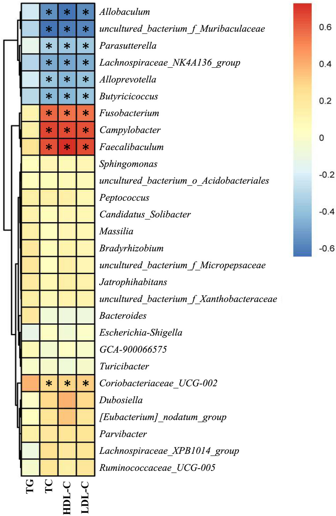 血清TC、HDL-C和LDL-C水平與細菌菌屬的相對豐度有關,Allobaculum、Alloprevotella、Butyricicoccus、Lachnospiraceae_NK4A136_group、Parasutterella和uncultured_bacterium_f_Muribaculaceae與血脂水平呈負相關,Campylobacter、 Coriobacteriaceae_UCG-002、Faecalibaculum和Fusobacterium與血脂呈正相關(圖8)。