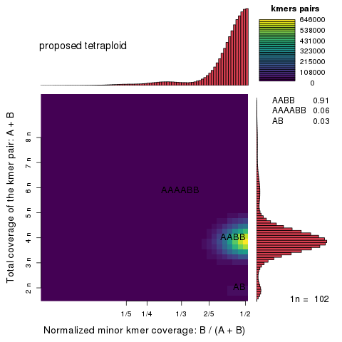 Figure 4一個四倍體的smudgeplot分析結果,橫軸是雜合k-mer對的深度占總深度的比例,縱軸是所有k-mer對的總深度,二者的交點即代表了不同的雜合結構。交點的亮度代表了落入其中的k-mer數(shù)。