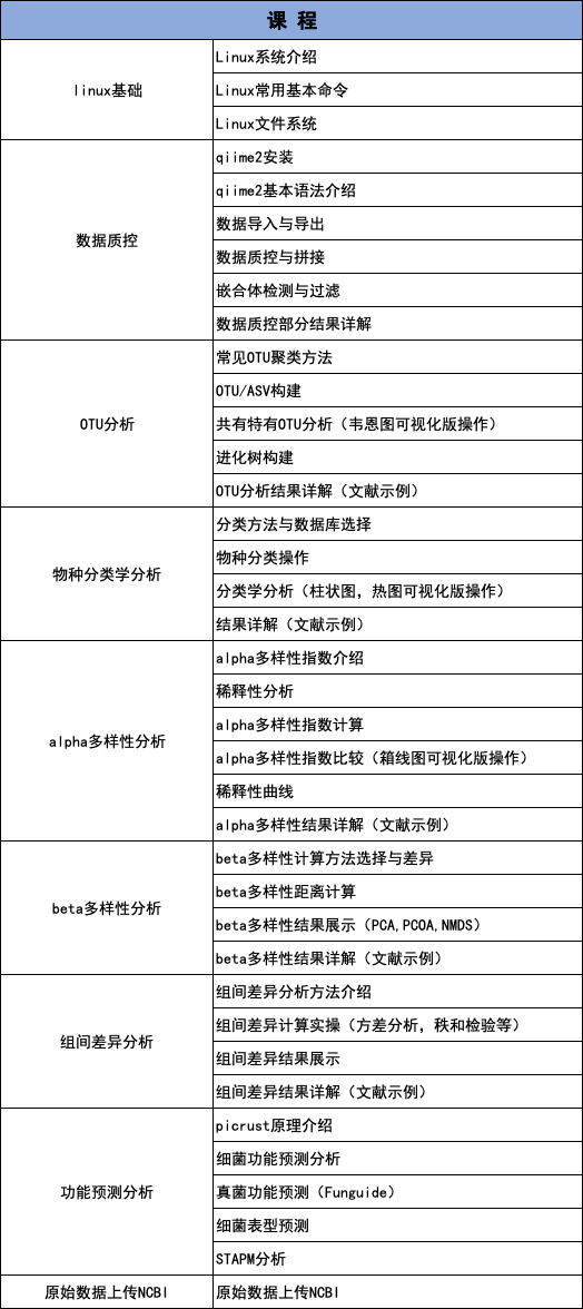 想學(xué)習(xí)如何分析微生物多樣性數(shù)據(jù)?想了解每步操作參數(shù)的意義?百邁客針對老師們對微生物多樣性內(nèi)容的需求,特開辦微生物多樣性生信課程,面向全體科研工作者,系統(tǒng)學(xué)習(xí)微生物多樣性分析中常規(guī)內(nèi)容與分析過程。課程設(shè)計覆蓋linux基本操作、QIIME2數(shù)據(jù)分析、百邁客云分析三部分內(nèi)容。
