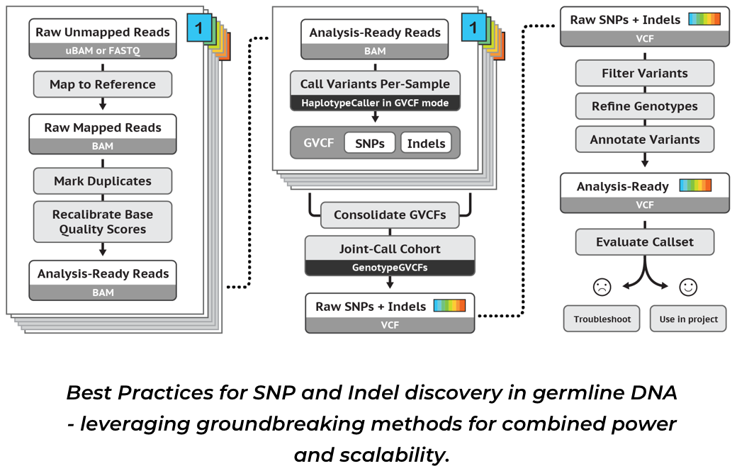GATK全稱是The Genome Analysis Toolkit,是Broad Institute(The Broad Institute, formerly the Broad Institute of MIT and Harvard, evolved from a decade of research collaborations among MIT and Harvard scientists.)開發(fā)的用于二代重測序數據分析的一款軟件,里面包含了很多有用的工具,主要注重與變異的查找,基因分型且對于數據質量保證高度重視。GATK是目前業(yè)內使用較廣的基因數據變異檢測工具。本次課程基于GATK的Best?Practices,實現從原始的比對結果開始,到最終的高質量突變位點的完整信息分析流程。