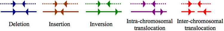 高通量測序數據除了可以分析SNP/InDel位點外,還可以利用雙端測序的中的插入片段長度信息和比對時出現的異常比對結果,對測序樣本中可能存在的結構變異進行分析。本次課程主要利用BreakDancer這款軟件進行結構變異位點的分析,軟件主要預測了五種類型的結構變異:插入、缺失、倒位、染色體間和染色體內易位,