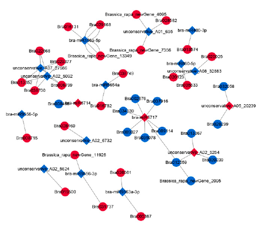 研究人員對油菜細胞質(zhì)雄性不育系進行了全轉(zhuǎn)錄組測序,鑒定出一些與花藥發(fā)育相關(guān)的基因、circRNA和miRNA,利用Cytoscape構(gòu)建mirna介導的調(diào)控網(wǎng)絡和ceRNA網(wǎng)絡,重構(gòu)了這些RNAs之間的調(diào)控關(guān)系,并對于關(guān)鍵的子網(wǎng)絡相關(guān)基因進行了功能注釋分析,挖掘出調(diào)控的關(guān)鍵功能通路,加深了對花藥發(fā)育及雄性不育的理解。