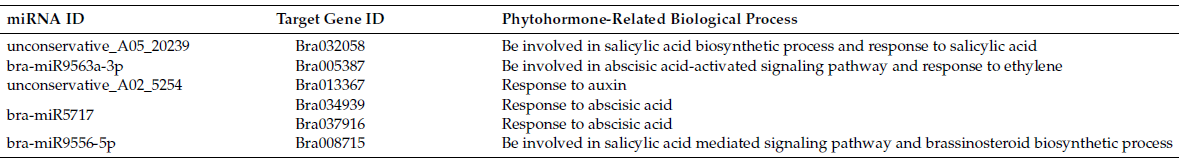 作者使用了TargetFinder來預測miRNA的靶基因,結(jié)合差異分析的結(jié)果最終得到170對miRNA和基因的調(diào)控關(guān)系,包含了18個miRNA和37個基因。對這些基因進行GO富集分析,發(fā)現(xiàn)主要是細胞過程、代謝過程等功能。對構(gòu)建的網(wǎng)絡進行研究發(fā)現(xiàn)miRNA所調(diào)控的基因主要是涉及糖代謝、脂質(zhì)代謝、花粉管生長等,同時也發(fā)現(xiàn)這些miRNA與植物激素相關(guān),比如bra-miR9556-5p可能通過靶向Bra008715來參與水楊酸介導的信號通路和油菜素類固醇生物合成過程途徑。