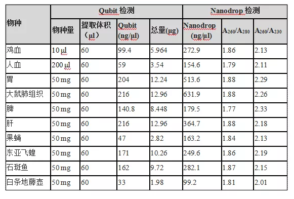 1.DNA濃度/純度檢測:提取不同動(dòng)物組織中的DNA,然后檢測DNA的濃度和吸光度。