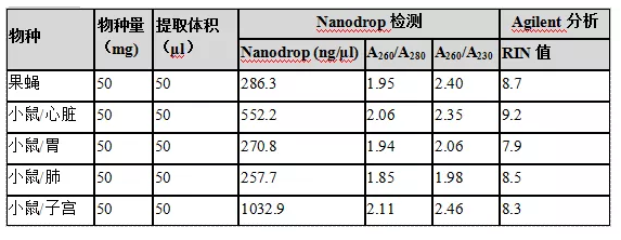 1.RNA濃度檢測:Nanodrop檢測A260/A280值在2.0左右,表明提取的RNA純度高,且濃度高。同時(shí)Agilent 2100生物分析儀檢測的RIN值接近10,表明RNA無降解,完整性好。
