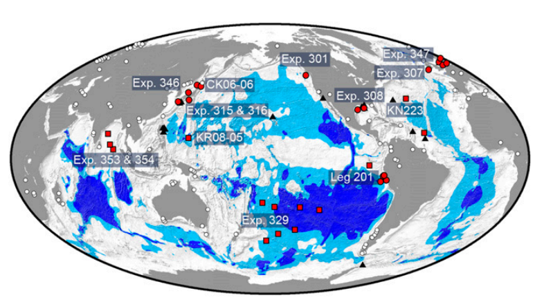 圖1 采樣地點(diǎn)的位置。紅色圓圈分別表示海洋邊緣站點(diǎn),紅色方塊分別表示開放海洋站點(diǎn)。淺藍(lán)色和深藍(lán)色區(qū)域分別顯示整個沉積物中可能發(fā)生溶解氧和有氧活動的最大和最小區(qū)域。在14次科學(xué)考察中,從40個地點(diǎn)采集了海底以下許多不同深度的299個沉積物樣本,用于比較不同全球海底沉積物微生物群落組成。