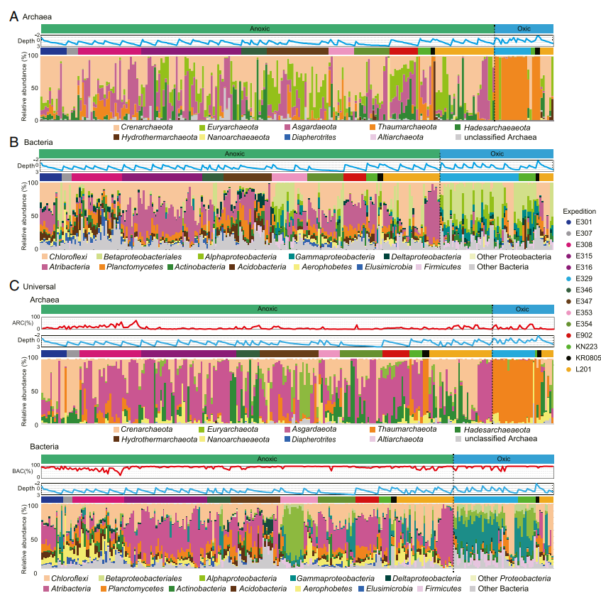圖3 海洋沉積微生物群落的物種區(qū)系組成。(A)使用古菌特異性引物獲得的235個樣品的古菌群落組成。(B)使用細(xì)菌特異性引物獲得的272個樣品的細(xì)菌群落組成。(C)使用通用引物獲得的245個樣品的古菌群落組成和281個樣品的細(xì)菌群落組成,未顯示少于1,000條序列的樣本。淺藍(lán)色折線圖以對數(shù)刻度顯示沉積物深度。