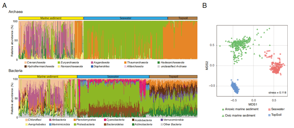 為了評估海洋沉積微生物群落與其他主要環(huán)境中微生物群落的關(guān)系,作者將海洋沉積物通用引物與使用相同通用引物的引物進(jìn)行微生物群落分析的海水和表層土壤的已發(fā)表序列進(jìn)行了比較。本研究中這三種生態(tài)環(huán)境的微生物群落中的細(xì)菌和古菌群落組成明顯不同(圖4)。如圖3所示,Crenarchaeota和Asgardaeota在海洋沉積物中占優(yōu)勢,而Euryarchaeota和Thaumarchaeota在海水中占優(yōu)勢,而Thaumarchaeota在表層土壤中占優(yōu)勢。細(xì)菌群落組成表明變形桿菌在表層土壤和海洋中占據(jù)優(yōu)勢。此外,Cyanobacteria,Marinimicrobia和Bacteroidetes在海水中占主導(dǎo)地位,而Acidobacteria和Verrucomicrobia在表層土壤中更為重要。在海洋沉積物中普遍存在著Atribacteria和Aerophobetes,但其他兩個環(huán)境中卻沒有這些細(xì)菌,這表明海洋沉積微生物構(gòu)成了一個獨(dú)特的生物群落。ASV組成的樣品間相似性表明這三個生物群落中的群落不同(圖4B),海洋沉積物中樣品間的多樣性更高。與其他環(huán)境相比,這種高多樣性可能反映了海洋沉積物棲息地條件的劇烈變化。
