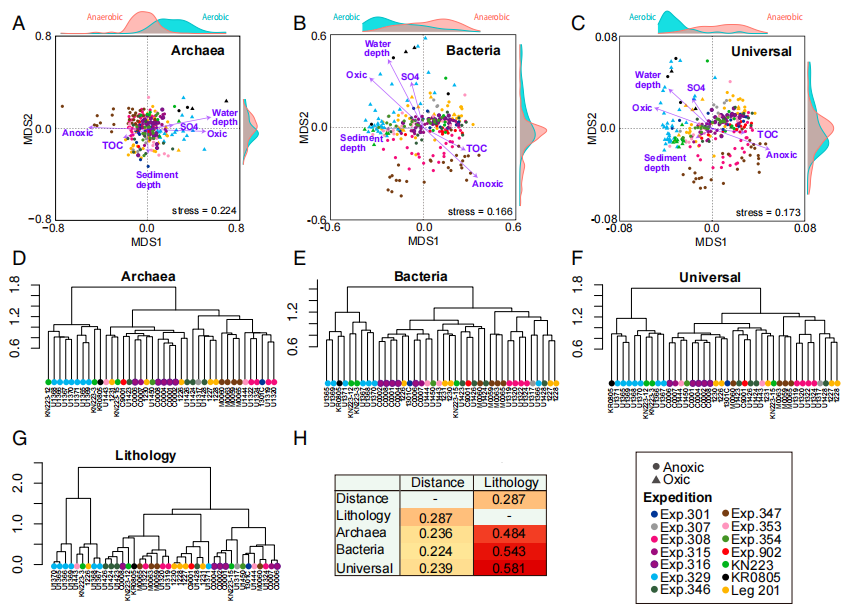 圖5 海洋沉積物微生物群落的β多樣性。(A–C)使用Jaccard相似性指數(shù)值生成的古菌(A),細(xì)菌(B)和通用引物數(shù)據(jù)集的NMDS排序圖。紫色箭頭表示與特征為P <0.01的環(huán)境因子相符的向量。(D–F)基于Jaccard相似性指數(shù)值,分別對40個地點(diǎn)的古菌(D),細(xì)菌(E)和通用引物數(shù)據(jù)集(F)進(jìn)行算術(shù)平均(UPGMA)樹狀圖的非加權(quán)成對分組法。(G)基于40處沉積物的礦物成分的UPGMA巖性樹狀圖。(H)確定地理距離或巖性是否與微生物群落組成相關(guān)。
