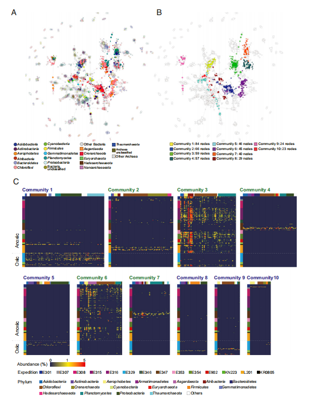 為了確定共現(xiàn)模式,作者基于使用通用引物獲得的ASV的Spearman相關(guān)性進(jìn)行了網(wǎng)絡(luò)分析(r> 0.6,P <0.05;圖6)。生成的網(wǎng)絡(luò)圖包含1,533個節(jié)點(diǎn)(ASV),網(wǎng)絡(luò)的模塊化程度很高(0.84)。在圖6B中,僅顯示了10個最大的模塊,其中5個群落在有氧環(huán)境中普遍存在的模塊(群落1、5、8、9和10)和五個在缺氧沉積物中普遍存在的ASV組成的模塊(群落2、3、4、6和7)。在這10個群落中,群落1包含最多數(shù)量的ASV(84個ASV),主要由Chloroflexi、Proteobacteria和Thaumarchaeota組成(圖6C)。網(wǎng)絡(luò)圖顯示,Chloroflexi和Thaumarchaeota是共現(xiàn)網(wǎng)絡(luò)的重要成員(圖6A)。在五個缺氧沉積物群落中,群落3主要由Atribacteria、Chloroflexi和Planctomyces組成。網(wǎng)絡(luò)分析表明Chloroflexi是海洋沉積物環(huán)境中重要的微生物組成。但是,幾乎所有Chloroflexi都與MSBL9相關(guān)聯(lián),有報道表明MSBL9適合利用多種復(fù)雜的糖聚合物。簡而言之,共生網(wǎng)絡(luò)分析表明,海洋沉積物微生物群落組成受沉積物中氧化還原態(tài)和電子供體的影響。該分析結(jié)果還表明,海底沉積微生物彼此相互作用,以有效利用這種極端環(huán)境中可用的有限基質(zhì)。