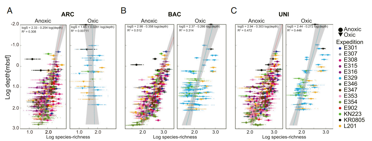 圖7 含氧海洋沉積物和缺氧海洋沉積物中微生物豐富度的深度分布。