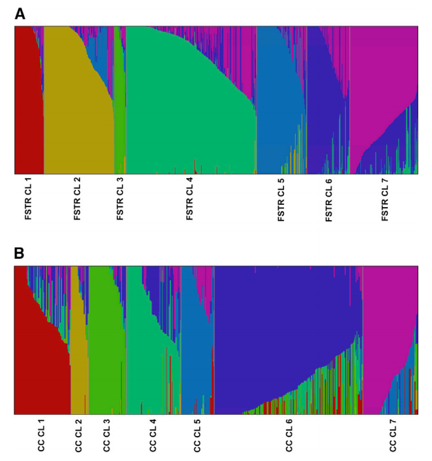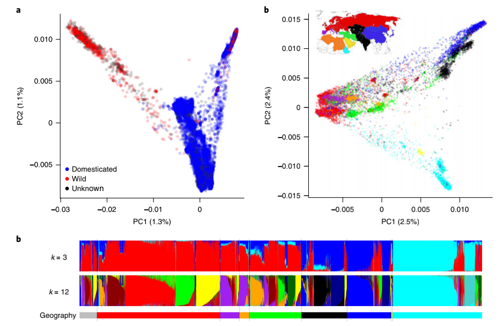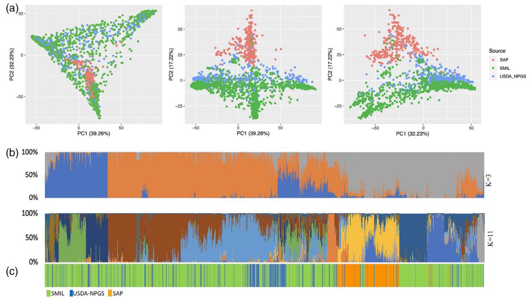 基因庫收集和保存大量植物和詳細(xì)的護(hù)照信息,目的是保護(hù)遺傳多樣性以進(jìn)行保護(hù)和育種。此類集合的遺傳表征有可能闡明重要作物的遺傳歷史,使用標(biāo)記-性狀關(guān)聯(lián)來鑒定感興趣性狀的位點(diǎn),尋找正在進(jìn)行選擇的位點(diǎn),并通過識(shí)別分類錯(cuò)配和重復(fù)為基因庫管理作出貢獻(xiàn)。本研究通過GBS測(cè)序?qū)碜匀蚧驇斓?0,038個(gè)辣椒 (Capsicum spp.) 種質(zhì)進(jìn)行基因分型,并調(diào)查了這種標(biāo)志性主食的近期歷史。基于SNP數(shù)據(jù)計(jì)算了identity-by-state (IBS) 比例,在基因庫內(nèi)和基因庫之間檢測(cè)到多達(dá) 1,618 個(gè)重復(fù)種質(zhì)。進(jìn)一步深入分析了常見食用辣椒的遺傳多樣性以調(diào)查其歷史,發(fā)現(xiàn)在全球廣泛地區(qū)收集的辣椒種類有很大的重疊。GWAS分析和選擇清除分析發(fā)現(xiàn)辣椒性狀,如刺激性,這些性狀在全球分布不均勻,表明人類偏好對(duì)馴化辣椒的遺傳結(jié)構(gòu)產(chǎn)生了主要影響。